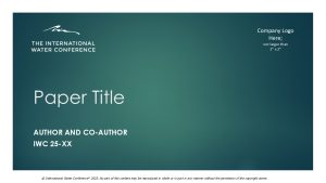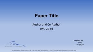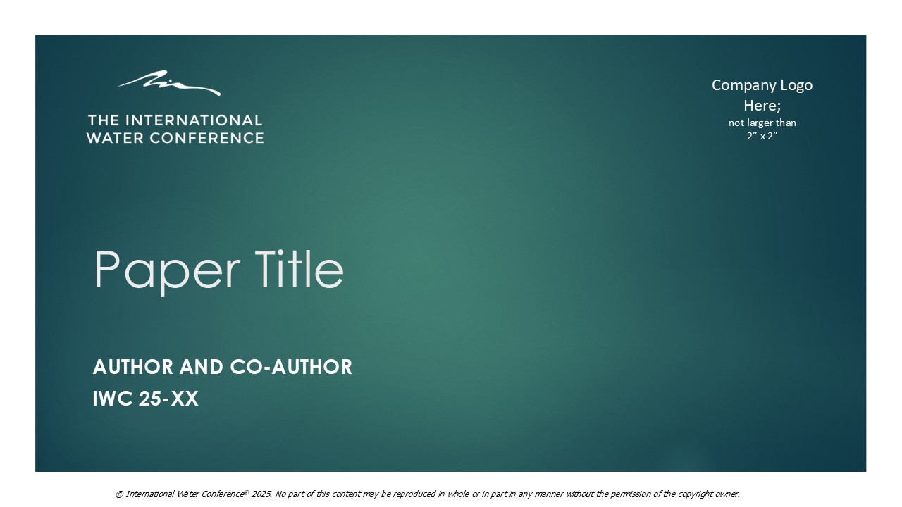 As stated on the Abstract Submittal form the IWC reserves the right of First Publication of any papers accepted for Presentation. If an author has a paper accepted for presentation, he / she must not submit it elsewhere for publication without the written consent of the IWC Committee. Upon publication by IWC, the paper becomes the copyright property of IWC. By accepting the invitation to present at the IWC, the Author acknowledges his / her intent to submit the Presentation for publication and obtain the required permissions and consents. The Engineers’ Society of Western Pennsylvania, sponsoring organization of the International Water Conference, is the copyright owner of the Preprint, the final presentation and paper, and of the prepared discussion thereof.
